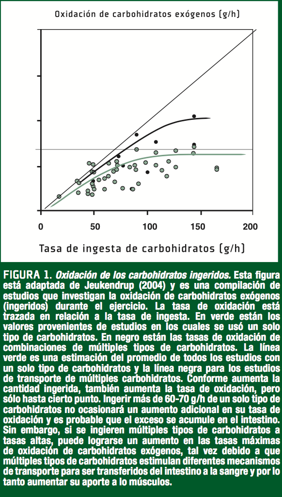Así, en años posteriores se llevaron a cabo diversos estudios (Jentjens et al., 2004 ab, 2005 ab, 2006; Wallis et al.,2007)4-10 que observaron una tasa de oxidación significativamente mayor con una combinación de dos partes de glucosa por una de fructosa, con maltodextrinas y fructosa y con glucosa más sacarosa y fructosa. Las mayores tasas de oxidación fueron para; 2 partes de glucosa por una de fructosa a una tasa de 144 gr/h, con este régimen se llegó a un máximo de 105 gr/h, es decir un 75% mayor de lo que previamente se pensaba que era el máximo de absorción.