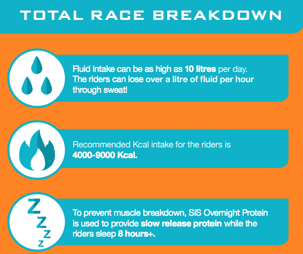 "Aprovisionar energía constantemente día a día es nuestro objetivo clave. Lo último que queremos hacer es consumir demasiada energía en una etapa más llana, y ciertamente no queremos tener energía insuficiente en una etapa de montaña. Trata de educar a los corredores de que cada etapa es diferente. Una cosa que podríamos cambiar día a día es la carga de energía en la bicicleta, y quizás la recuperación de energía después de la carrera. Es la frecuencia del abastecimiento de energía que cambia día a día. En una gran etapa de montaña, buscaremos 90 gramos de carbohidratos por hora. Y eso se compone de tres a cuatro unidades de carbohidratos por hora, que puede ser una torta de arroz que hacemos nosotros mismos, una barrita energética de Science in Sport, un gel energético Science in Sport o nuestras bebidas deportivas con carbohidratos fabricadas por Science in sport. En una gran etapa de montaña, se alimentarán cada 15 a 20 minutos ".